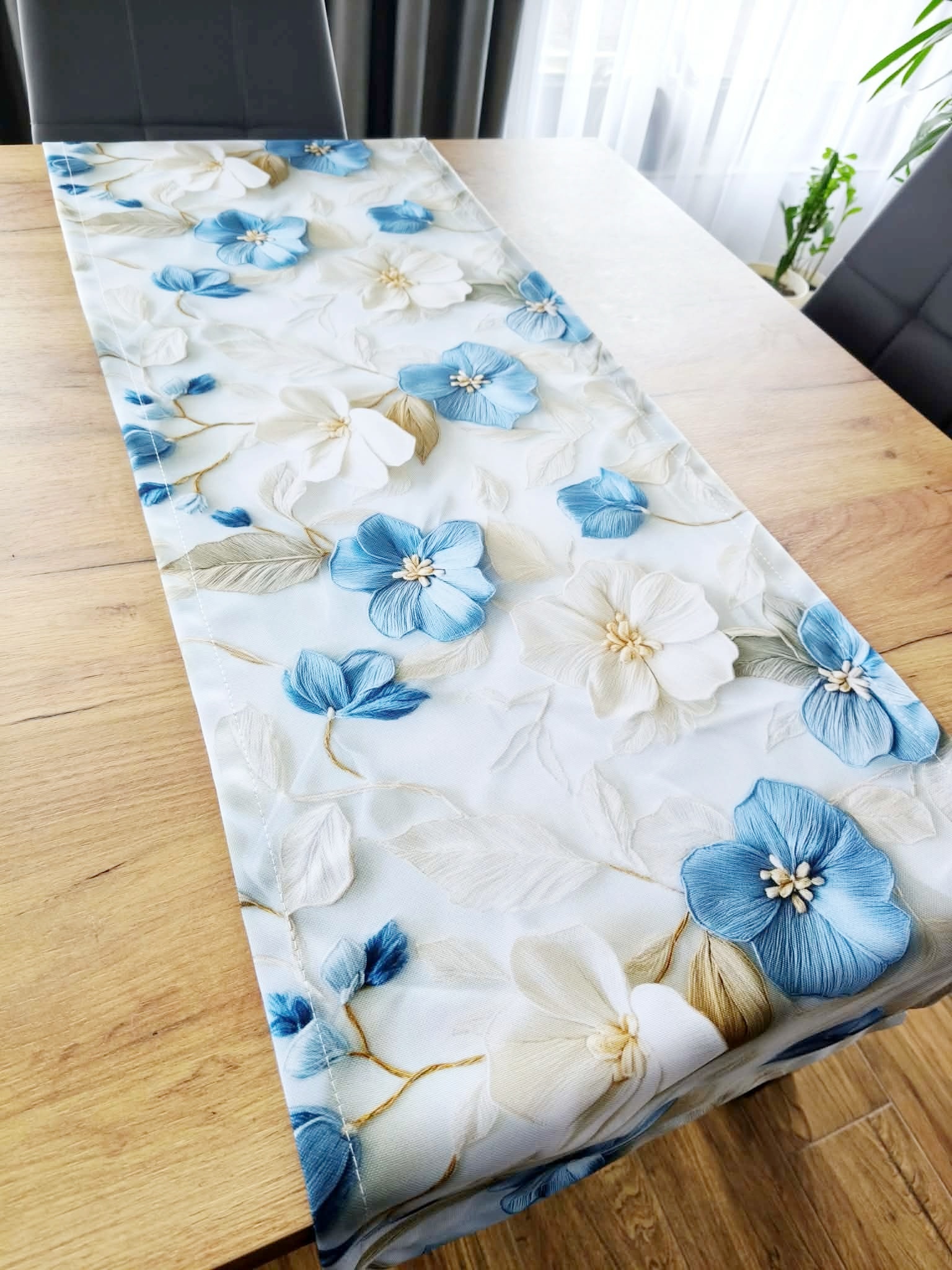 Bieżnik plamoodporny w błękitne kwiaty 3D - 135/40 różne warianty