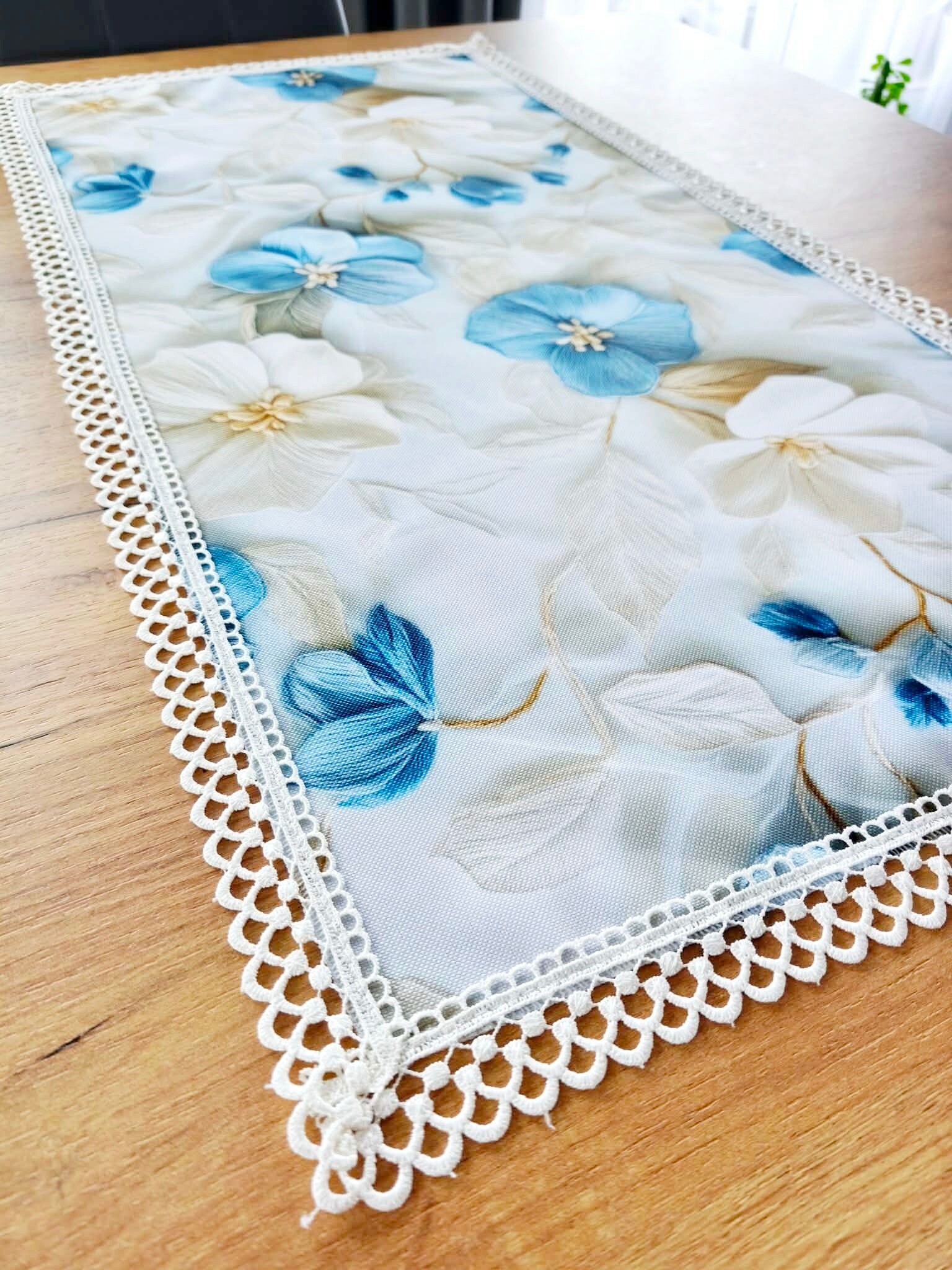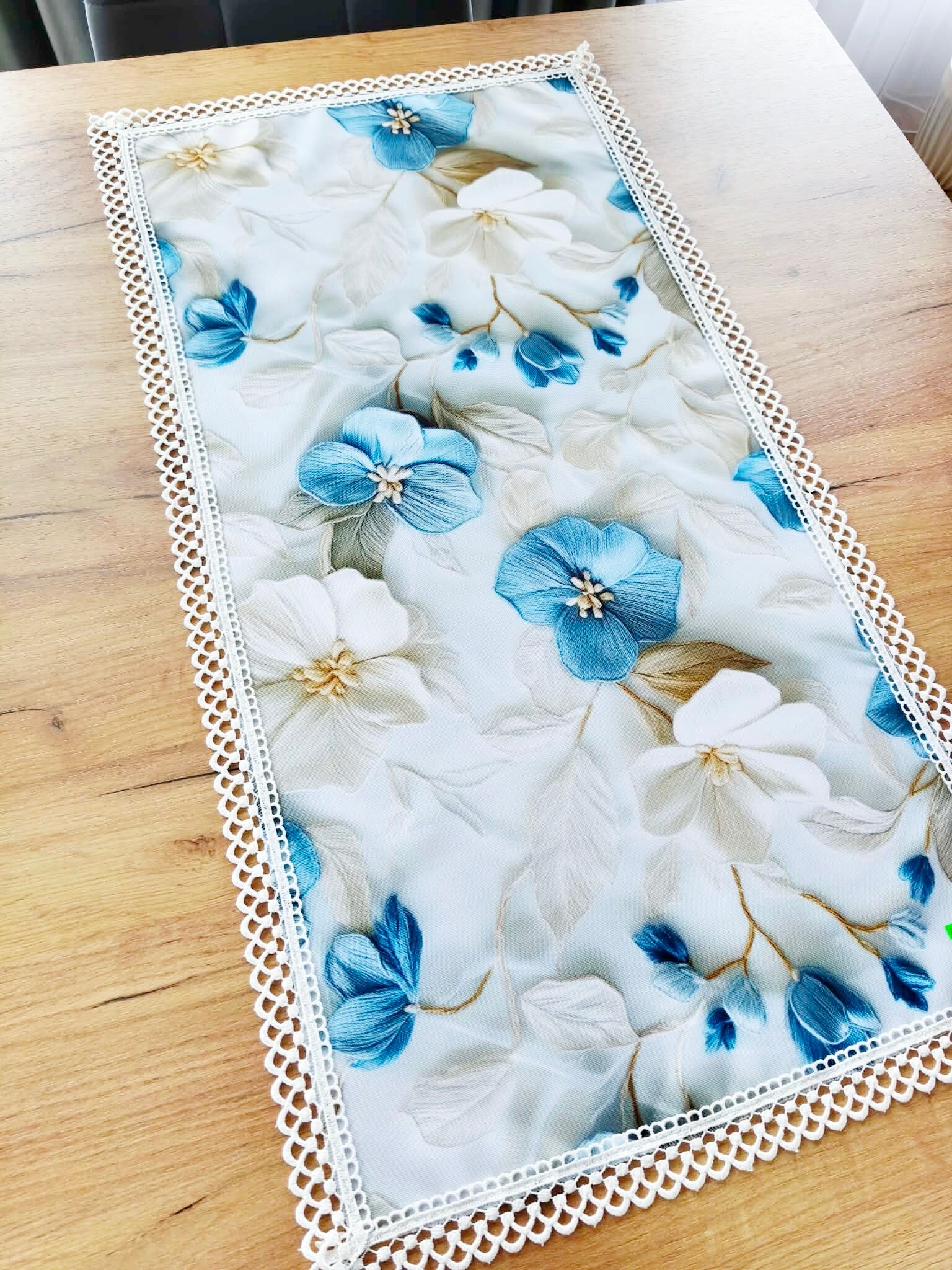 Bieżnik plamoodporny w błękitne kwiaty 3D z gipiurą - 85/45