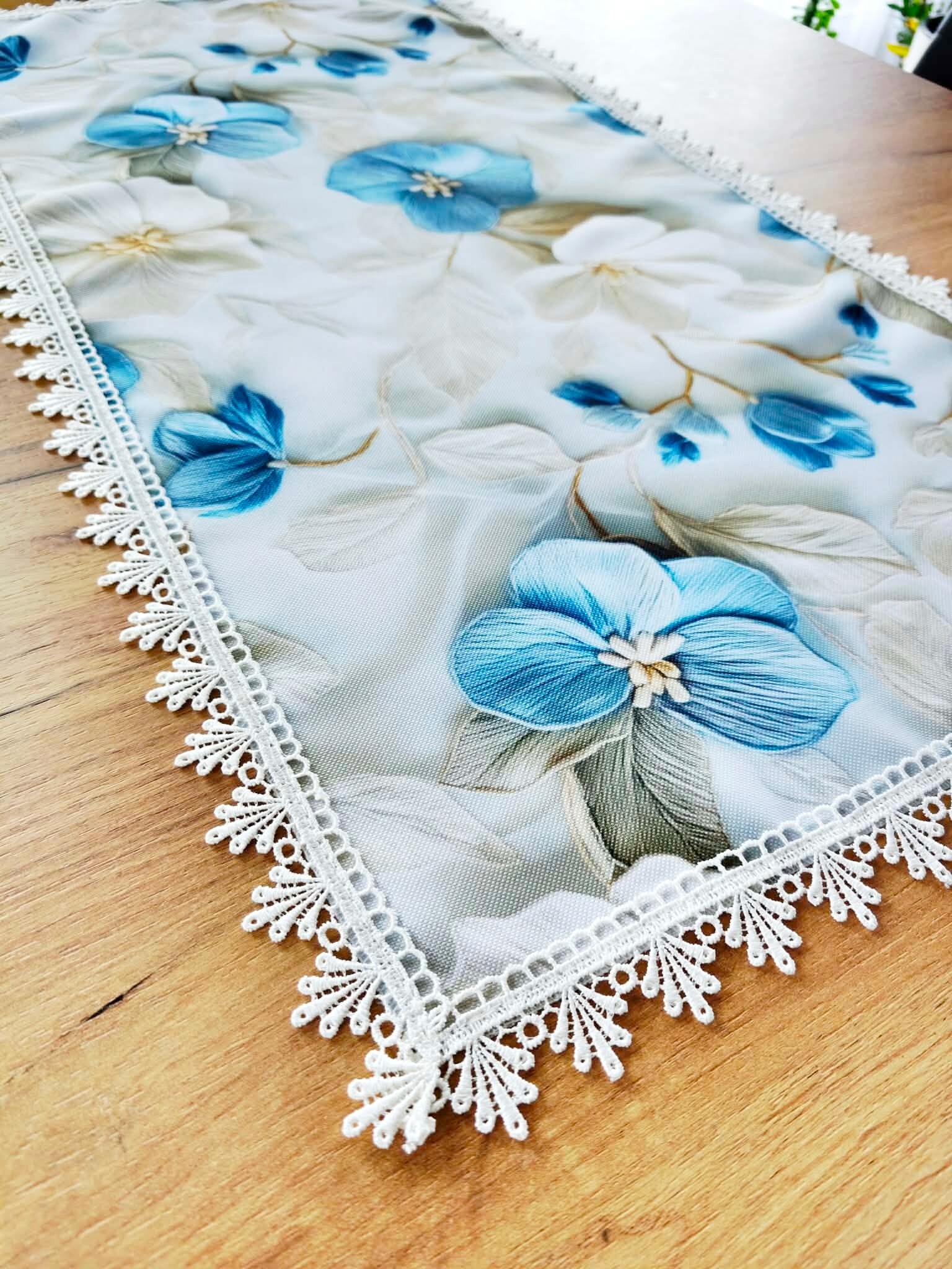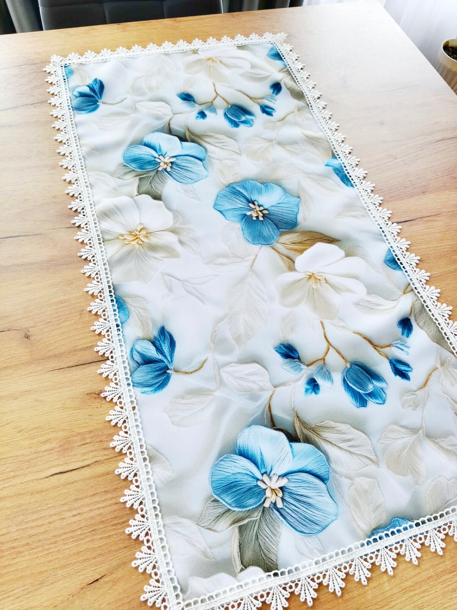 Bieżnik plamoodporny w błękitne kwiaty 3D z gipiurą - 85/45 warianty