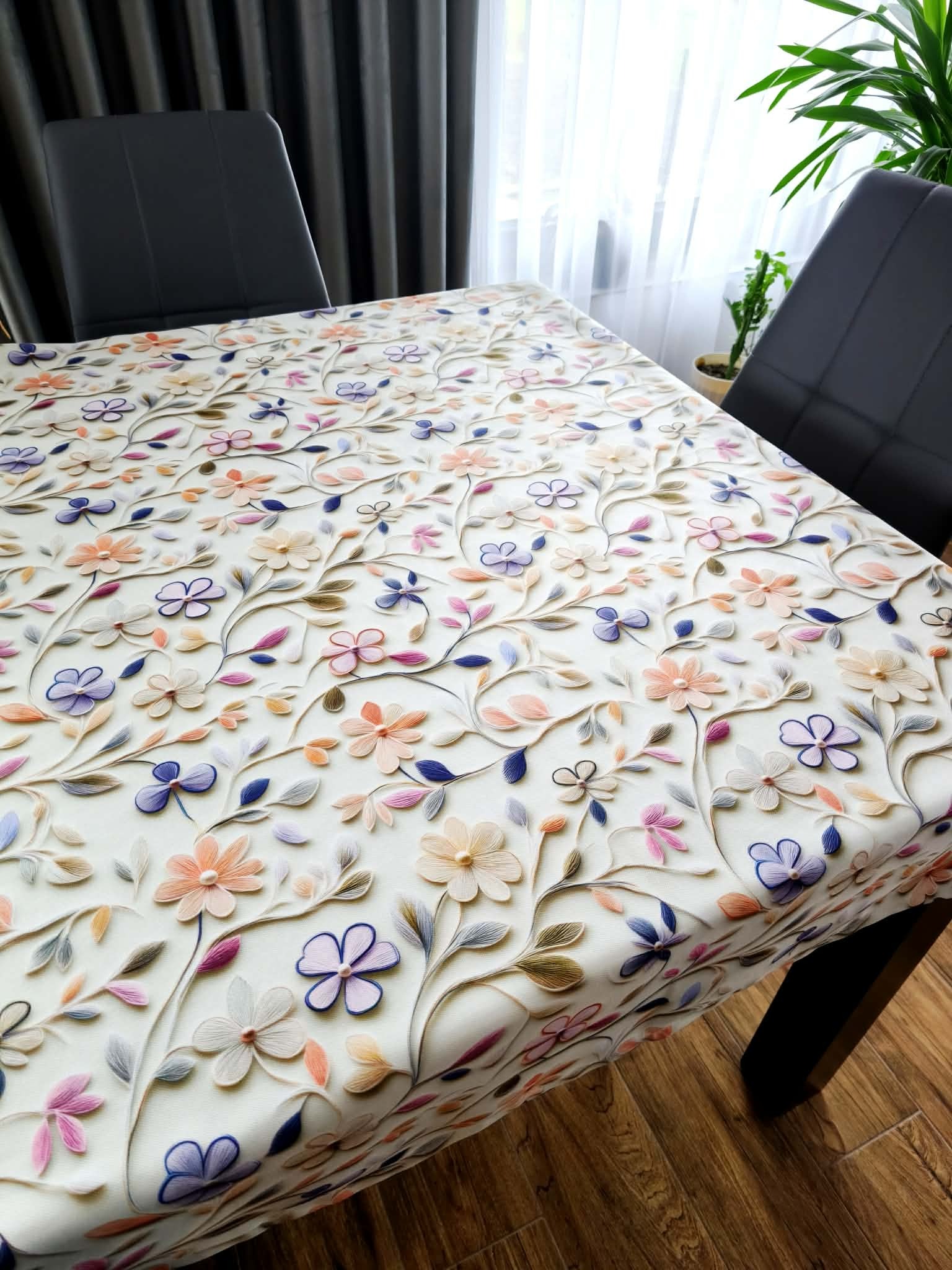 Obrus szyty na wymiar, z grubszej tkaniny obrusowej.